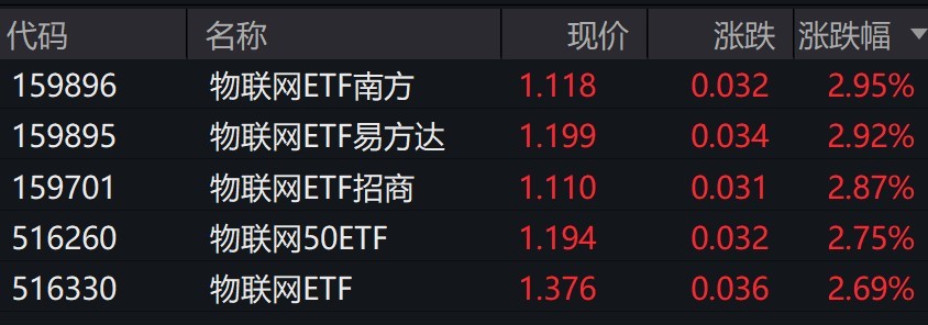 受盤面影響,跟蹤中證物聯(lián)網(wǎng)主題指數(shù)的ETF漲超2%。