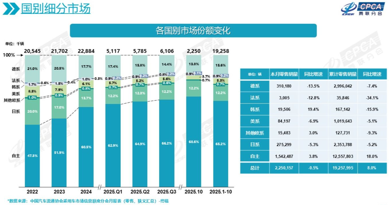 乘聯(lián)分會數(shù)據(jù)顯示,10月,自主品牌乘用車的市場份額已經(jīng)達(dá)到了68.6%;今年前10個(gè)月,自主品牌乘用車的市場份額為65.2%。