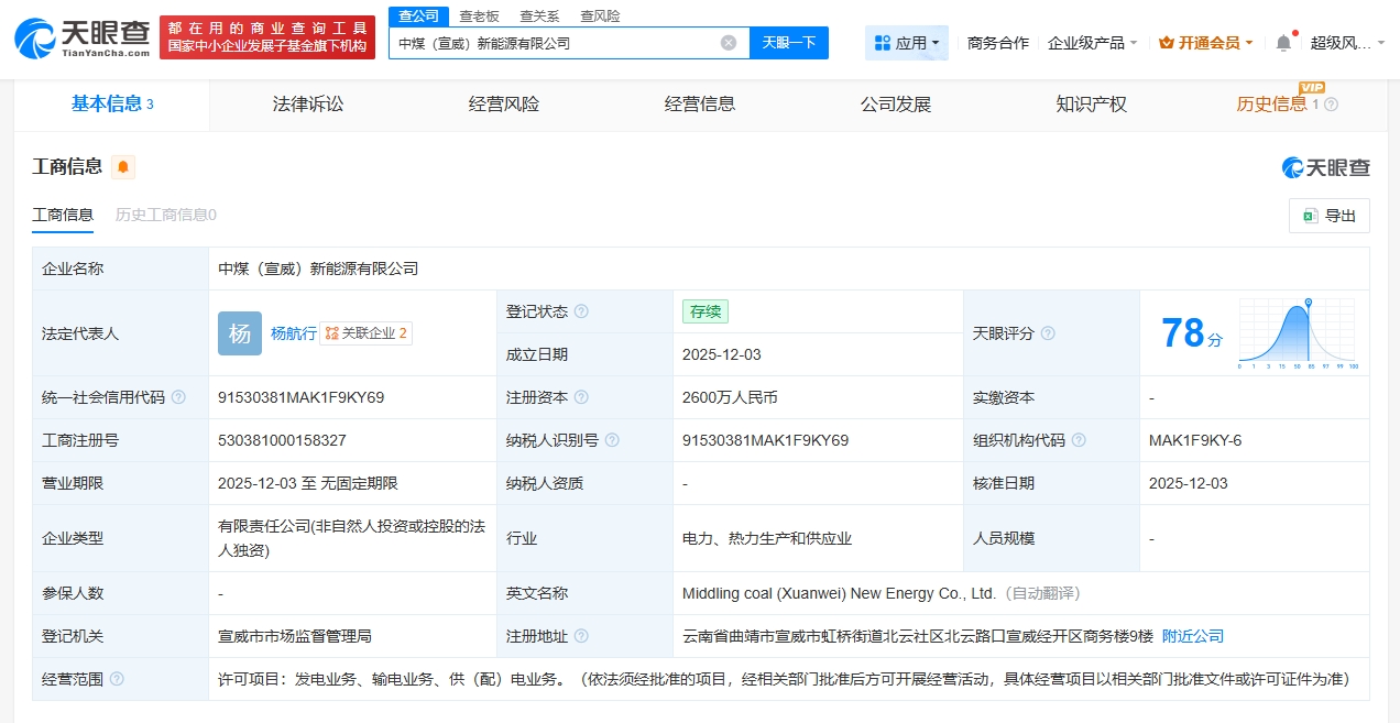 每經(jīng)AI快訊,天眼查App顯示,近日,中煤(宣威)新能源有限公司成立,法定代表人為楊航行,注冊資本2600萬元人民幣,經(jīng)營范圍包括發(fā)電業(yè)務(wù)、輸電業(yè)務(wù)、供(配)電業(yè)務(wù)。股權(quán)全景穿透圖顯示,該公司由中國中煤旗下中煤綠能科技(北京)有限公司全資持股。