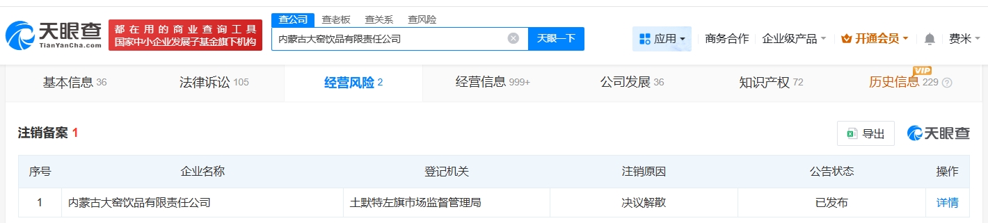 每經(jīng)AI快訊,天眼查經(jīng)營風(fēng)險(xiǎn)信息顯示,近日,內(nèi)蒙古大窯飲品有限責(zé)任公司新增一條注銷備案公告,注銷原因?yàn)闆Q議解散,公告期為2025年12月5日至2026年1月18日。該公司成立于2016年12月,法定代表人為羅云,注冊資本3000萬元人民幣,經(jīng)營范圍包括食品及生物技術(shù)的開發(fā)、技術(shù)咨詢、技術(shù)服務(wù)等,由大窯嘉賓飲品股份有限公司全資持股。