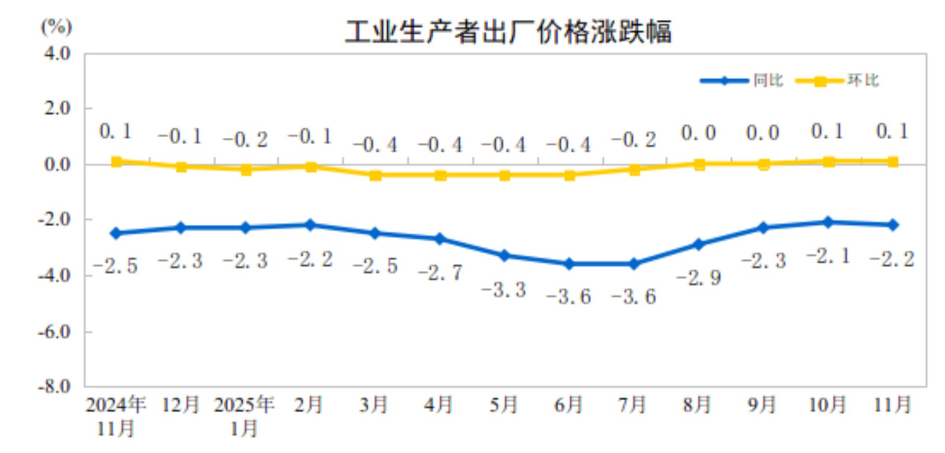 11月,PPI環(huán)比上漲0.1%,連續(xù)兩個月上漲。受上年同期對比基數(shù)走高影響,PPI同比下降2.2%,降幅比上月擴大0.1個百分點。