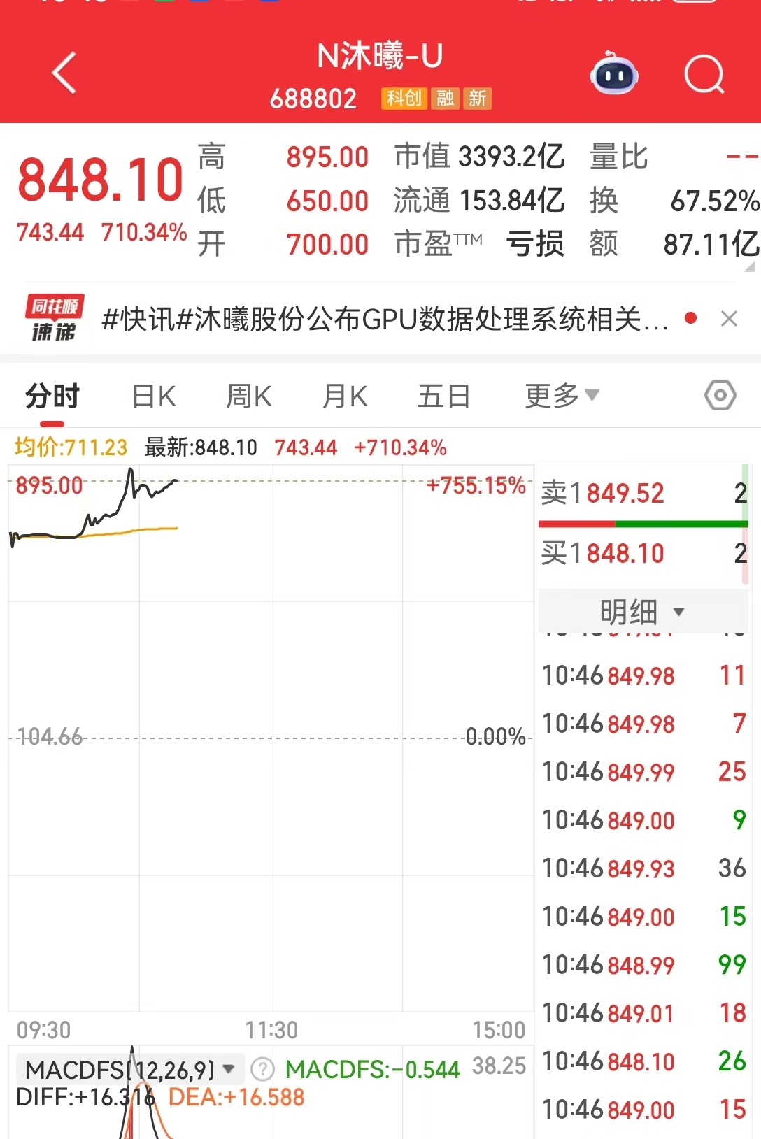 12月17日,沐曦股份(SH688802)繼續(xù)走強(qiáng),盤中一度拉升大漲超700%,總市值3393億元,超過摩爾線程。