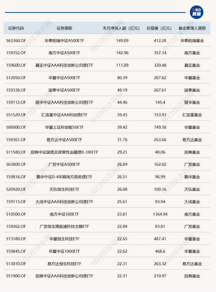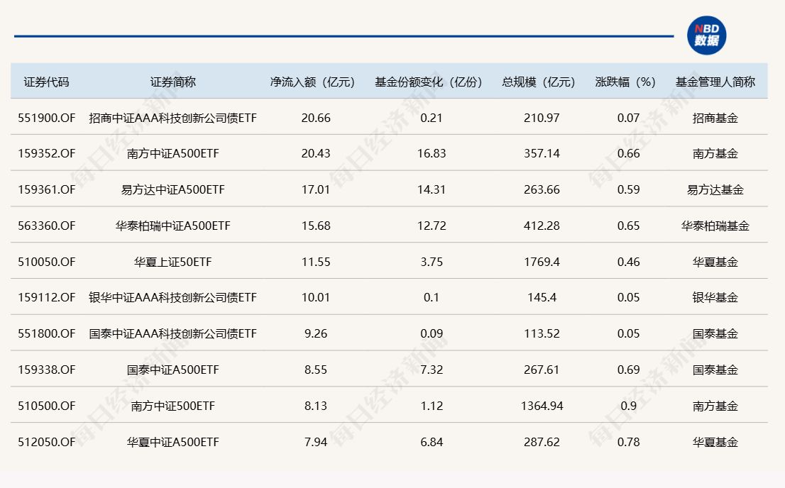 Wind數(shù)據(jù)顯示,在12月19日的非貨幣ETF市場中,招商中證AAA科技創(chuàng)新公司債ETF基金份額增加0.21億份,凈流入額20.66億元;南方中證A500ETF份額增加16.83億份,凈流入額20.43億元;易方達中證A500ETF份額增加14.31億份,凈流入額17.01億元。