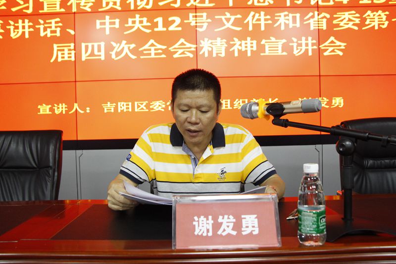 根據吉陽區(qū)委統(tǒng)一部署,學習貫徹習近平總書記“4·13”重要講話、中央12號文件和省委第七屆四次全會精神宣講會在明佳集團三樓會議室舉行。吉陽區(qū)委常委、組織部長謝發(fā)勇作宣講報告。集團黨支部書記、董事長陳明主持宣講會。