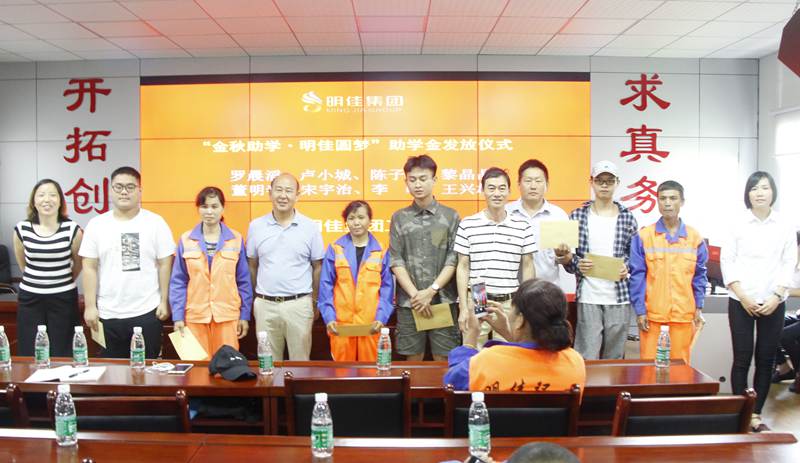 8月28日上午,明佳集團(tuán)工會(huì)“金秋助學(xué)·明佳圓夢(mèng)”助學(xué)金發(fā)放儀式在集團(tuán)公司三樓會(huì)議室舉行,為8個(gè)考取大學(xué)的職工子女發(fā)放助學(xué)金共計(jì)9600元??偛藐愒?、副總經(jīng)理鐘寒參加發(fā)放儀式,儀式由工會(huì)主席高斐斐主持。