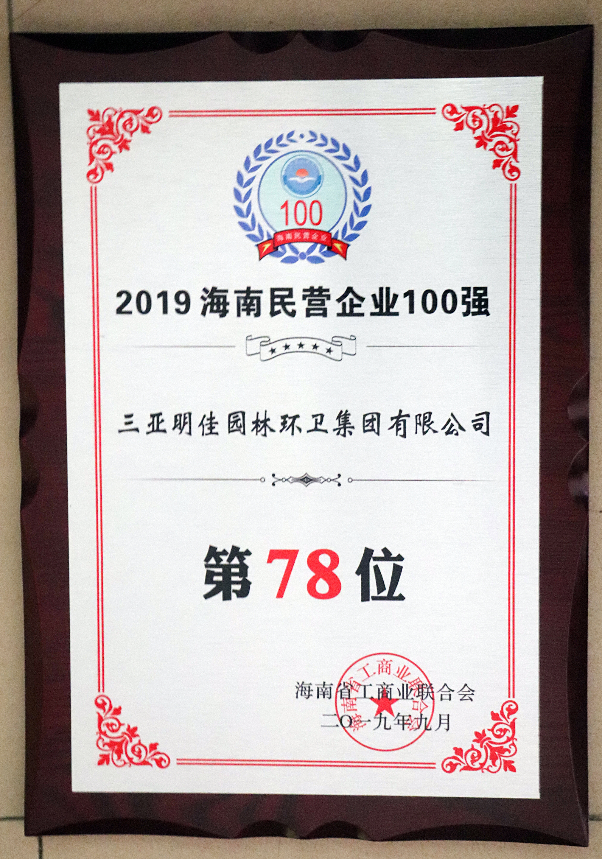 2019海南省民營企業(yè)100強證書