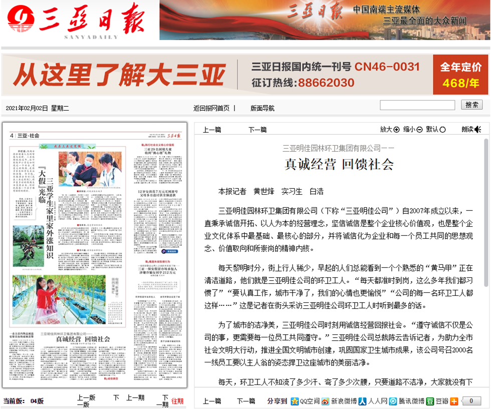 三亞明佳園林環(huán)衛(wèi)集團有限公司(下稱“三亞明佳公司”)自2007年成立以來,一直秉承誠信開拓、以人為本的經(jīng)營理念,堅信誠信是整個企業(yè)核心價值觀,也是整個企業(yè)文化體系中···